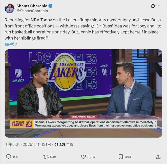 今天早些时候,NBA名记Shams报道,湖人正式开始重组球队的篮球运营部门,最主要的操作就是立即解除乔伊·巴斯和杰西·巴斯在管理层当中的职务。