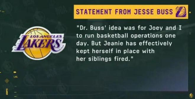 沃尔特岂能容忍前朝余孽仍把持湖人朝政,立即解除乔伊·巴斯和杰西·巴斯在球队管理层的职务。