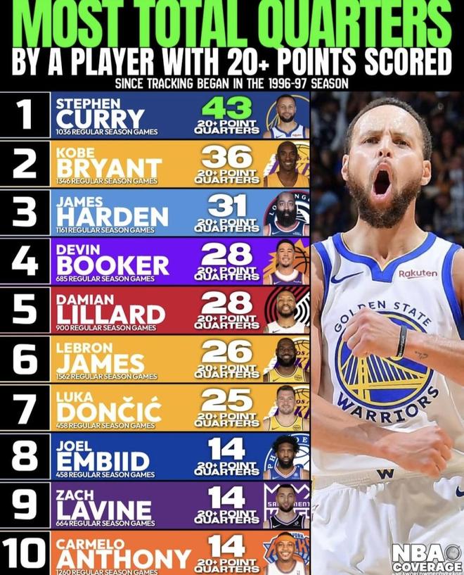 最近NBA Coverage发布了一份单节20分以上次数的排行榜,库里、科比、詹姆斯、东契奇等得分手全部在列。 榜单之外,像杜兰特、利纳德这种火力同样惊人的球星这次并没有出现,也难免让人多看两眼。 乍一看只是统计了谁一节爆发得最多,往下细看却会发现,一波流型的球员和整场稳定磨血的球员完全是两种路子。 到底该更看重单节的瞬间打疯,还是整季场均的长期输出?