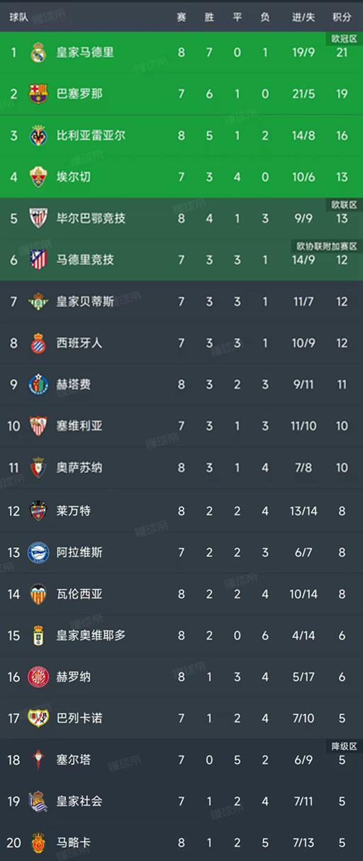 北京时间10月5日,西甲第8轮率先结束了5场比赛,最新积分榜如下!